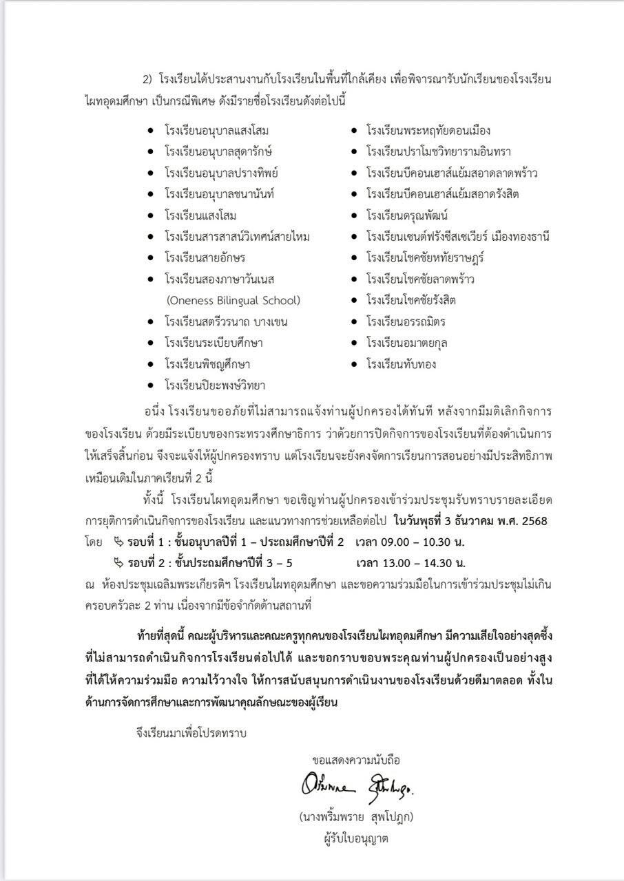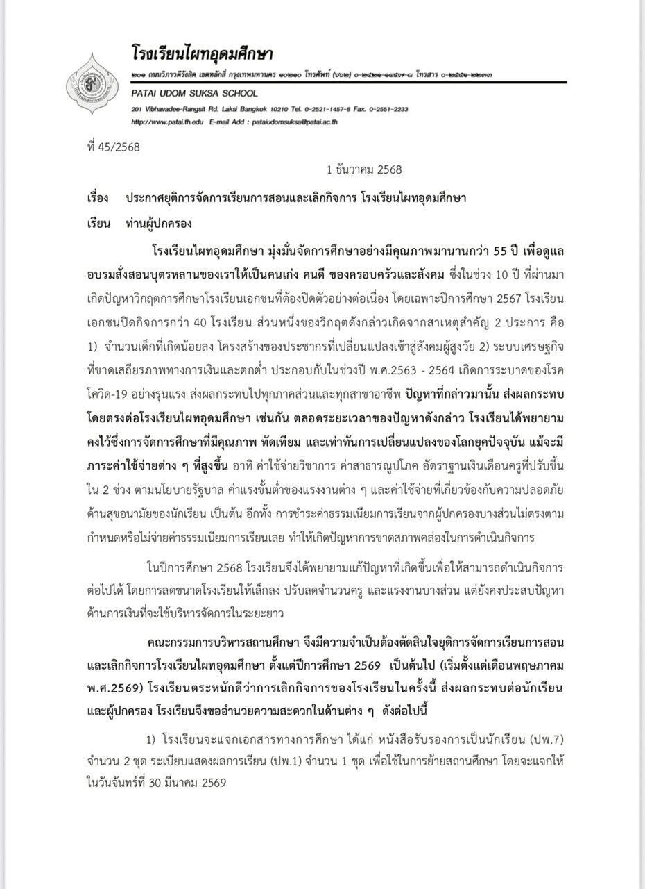 อนึ่ง โรงเรียนขออภัยที่ไม่สามารถแจ้งท่านผู้ปกครองได้ทันที หลังจากมีมติเลิกกิจการของโรงเรียน ด้วยมีระเบียบของกระทรวงศึกษาธิการ ว่าด้วยการปิดกิจการของโรงเรียนที่ต้องดำเนินการให้เสร็จสิ้นก่อน จึงจะแจ้งให้ผู้ปกครองทราบ แต่โรงเรียนจะยังคงจัดการเรียนการสอนเหมือนเดิมในภาคเรียนที่ 2 นี้ ทั้งนี้ โรงเรียนไผทอุดมศึกษา ขอเชิญท่านผู้ปกครองเข้าร่วมประชุมรับทราบรายละเอียดการยุติกิจการของโรงเรียน และแนวทางการช่วยเหลือในวันพุธที่ 3 ธันวาคม 2568 ท้ายที่สุดนี้ คณะผู้บริหารและคณะครูทุกคนของโรงเรียนไผทอุดมศึกษา มีความเสียใจอย่างสุดซิ้ง ที่ไม่สามารถดำเนินกิจการโรงเรียนต่อไปได้ และขอกราบขอบพระคุณท่านผู้ปกครองเป็นอย่างสูง ที่ได้ให้ความร่วมมือ ความไว้วางใจ ให้การสนับสนุนการดำเนินงานของโรงเรียนด้วยดีมาตลอด ทั้งใน ด้านการจัดการศึกษาและการพัฒนาคุณลักษณะของผู้เรียน