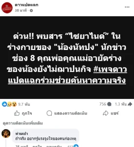 “ด่วน!! พบสาร ‘ไซยาไนด์’ ในร่างกายของน้องนัทปง นักข่าวช่อง 8
