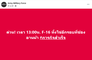 ล่าสุดเพจ Army Military Force ได้โพสต์ข้อความว่า ด่วน! เวลา 13:00น. F-16 ทิ้งไข่อีกรอบที่ช่องอานม้า #ภารกิจสำเร็จ