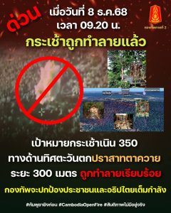 . เมื่อ 8 ธ.ค.68เวลา 09.20 น. เป้าหมายกระเช้าเนิน 350 ทางด้านทิศตะวันตกปราสาทตาควาย ระยะ 300 เมตร ถูกทำลายเรียบร้อย กองทัพจะปกป้องประชาชนและอธิปไตยเต็มกำลัง