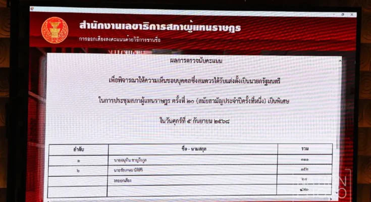 จากผลการโหวตเลือกนายกรัฐมนตรี ที่ทาง นายอนุทิน ชาญวีรกูล จากพรรคภูมิใจไทย ได้รับเสียงโหวตท่วมท้น นั่งนายกฯคนที่32ของไทย โดยที่ประชุมสภาฯ ได้ลงมติ ให้ความเห็นชอบนายอนุทิน เป็นนายกรัฐมนตรีคนที่32 ด้วยคะแนนเสียง  311 คะแน เกินกึ่งหนึ่งของเสียงทั้งหมดในสภาฯ ขณะที่ นาย ชัยเกษม นิติสิริ แคนดิเดตนายกรัฐมนตรีจากพรรคเพื่อไทย ได้ 152 คะแนน ซึ่งมีการงดออกเสียง 27 คะแนน