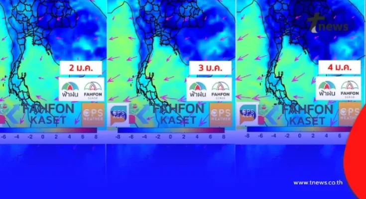 วันที่ 30 ธ.ค. 2568 เพจเฟซบุ๊ก “พยากรณ์อากาศประเทศไทย” ซึ่งจัดทำการพยากรณ์อากาศละเอียดสูง โดยบริษัท ซีพีเอส เวเธอร์ จำกัด และ ซีพีเอส อะกริ จำกัด ได้เผยแพร่ภาพคาดการณ์อุณหภูมิในช่วงเวลา 07.00 น. ของแต่ละวัน เปรียบเทียบกับอุณหภูมิของวันที่ 12 พฤศจิกายน ซึ่งใช้เป็นวันอ้างอิง พร้อมระบุข้อความเตือนว่า “เตรียมเย็นลงอีกช่วง 4–11 ม.ค.”