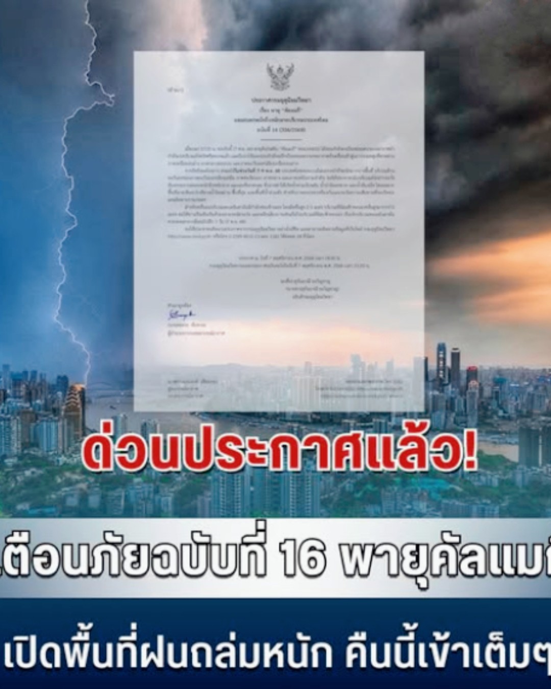 เมื่อวันที่ 7 พฤศจิกายน 2568 กรมอุตุนิยมวิทยา ประกาศ เรื่อง พายุคัลแมกี และฝนตกหนักถึงหนักมากบริเวณประเทศไทย ฉบับที่ 16 (336/2568)