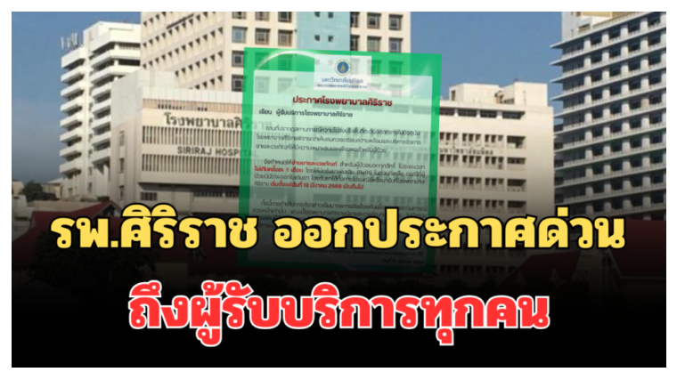 วันที่ 19 มีนาคม 2569 โรงพยาบาลศิริราช ได้ออกประกาศแจ้งผ่านเพจ Siriraj Hospital ถึงผู้รับบริการโรงพยาบาลศิริราชทุกคน โดยระบุว่า