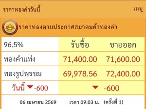 ราคาทองคำวันนี้ 6 เมษายน 2569 โดย สมาคมค้าทองคำ ประกาศราคาทองครั้งที่ 1 (เปิดตลาด) เมื่อเวลา 09.03 น. ปรับตัวลงแรง 600 บาท สู่บริเวณ 71,600 บาท