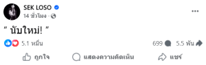 ล่าสุด มีรายงานว่า ด้าน นายเสกสรรค์ ศุขพิมาย หรือ เสก โลโซ นักร้องชื่อดัง ได้ออกมาเคลื่อนไหวด้วยการโพสต์ข้อความสั้น ๆ ผ่านบัญชีเฟซบุ๊ก SEK LOSO โดยระบุว่า “นับใหม่!”