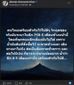 คนไทยเตรียมตัวกันไว้ให้ดีๆ วิกฤตของจริงมันจะมาในอีก 4-5 เดือนข้างหน้านี้ โดยที่ทุกคนหลีกเลี่ยงมันไม่ได้ เพราะน้ำมันดิบที่สั่งซื้อไว้ จะขาดช่วงและ เดินทางมาไม่ถึง ส่อเป็นอัมพาตชั่วคราว