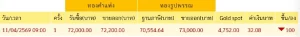 รายงานความเคลื่อนไหวราคาทองคำในประเทศ วันที่ 12 เมษายน 2569 โดยราคายังคงอ้างอิงข้อมูลล่าสุดเมื่อวันที่ 11 เมษายน 2569 เวลา 09:00 น. ซึ่งมีการปรับลดลง 100 บาทจากรอบก่อนหน้า โดยราคาทองคำมีดังนี้ ทองคำแท่ง รับซื้อ: 72,000.00 บาท ขายออก: 72,200.00 บาท ทองรูปพรรณ ฐานภาษี: 70,554.64 บาท ขายออก: 73,000.00 บาท ราคาทองคำโลก (Gold Spot): 4,752.00 ดอลลาร์ ค่าเงินบาท: 32.08 บาทต่อดอลลาร์