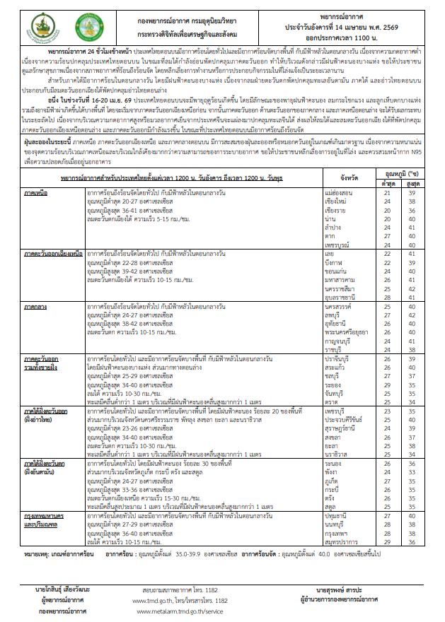 วันที่ 14 เมษายน 2569 กรมอุตุนิยมวิทยาได้พยากรณ์อากาศ 24 ชั่วโมงข้างหน้า ประเทศไทยตอนบนมีอากาศร้อนโดยทั่วไปและมีอากาศร้อนจัดบางพื้นที่ กับมีฟ้าหลัวในตอนกลางวัน เนื่องจากความกดอากาศต่ำ เนื่องจากความร้อนปกคลุมประเทศไทยตอนบน ในขณะที่ลมใต้กำลังอ่อนพัดปกคลุมภาคตะวันออก