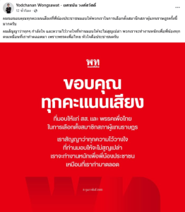 ขณะเดียวกัน เฟซบุ๊ก ดร.เชน Yodchanan Wongsawat – ยศชนัน วงศ์สวัสดิ์ ได้ออกมาเคลื่อนไหว โดยระบุข้อความว่า ผมขอขอบคุณทุกคะเนนเสียงที่พี่น้องประชาชนมอบให้พวกเราในการเลือกตั้งสมาชิกสภาผู้แทนราษฎรครั้งนี้มากครับ