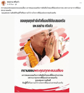 กราบขอบพระคุณทุกคะแนนเสียง เคารพและยอมรับการตัดสินใจของพี่น้องประชาชน เพราะเรามาจากพี่น้องประชาชนครับ ขอแสดงความยินดีกับผู้ที่ได้รับความไว้วางใจจากพี่น้องประชาชนด้วยครับ