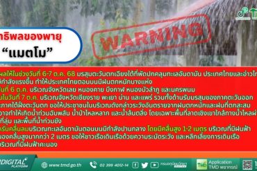 วันที่ 5 ต.ค. 68 อิทธิพลของพายุ แมตโม ส่งผลช่วงวันที่ 6-7 ต.ค. 68 มรสุมตะวันตกเฉียงใต้ที่พัดปกคลุมทะเลอันดามัน ประเทศไทย และอ่าวไทยจะมีกำลังแรงขึ้น ทำให้ประเทศไทยตอนบนมีฝนตกหนักบางแห่งในวันที่ 6 ต.ค. บริเวณจังหวัดเลย หนองคาย บึงกาฬ หนองบัวลำภู และนครพนม วันที่ 7 ต.ค. บริเวณจังหวัดเชียงราย…